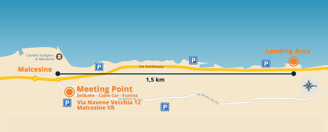 Il giorno del tuo volo è arrivato. Il punto di incontro è alla stazione di valle nel paese di Malcesine, della Funivia Malcesine-Monte Baldo.